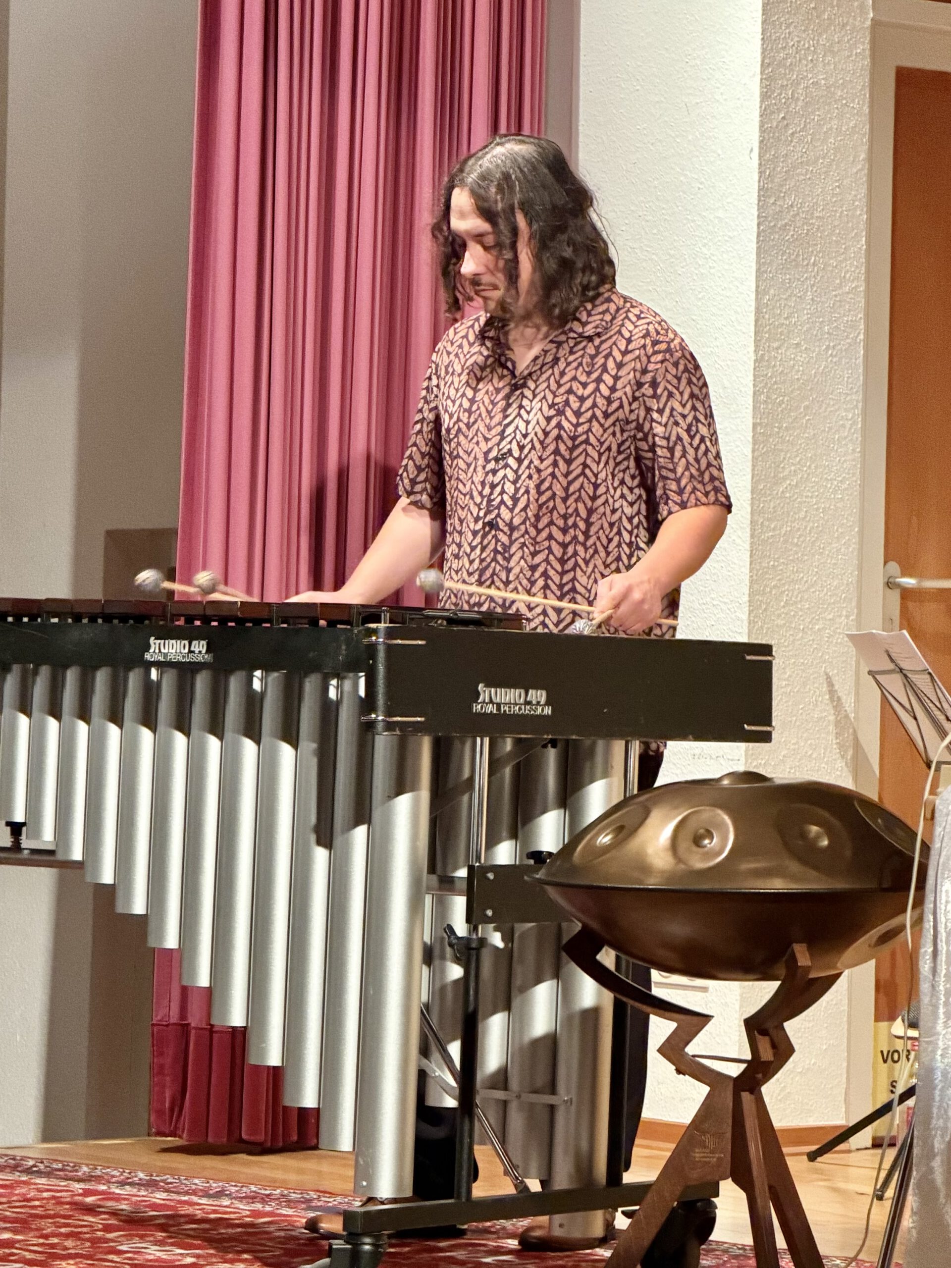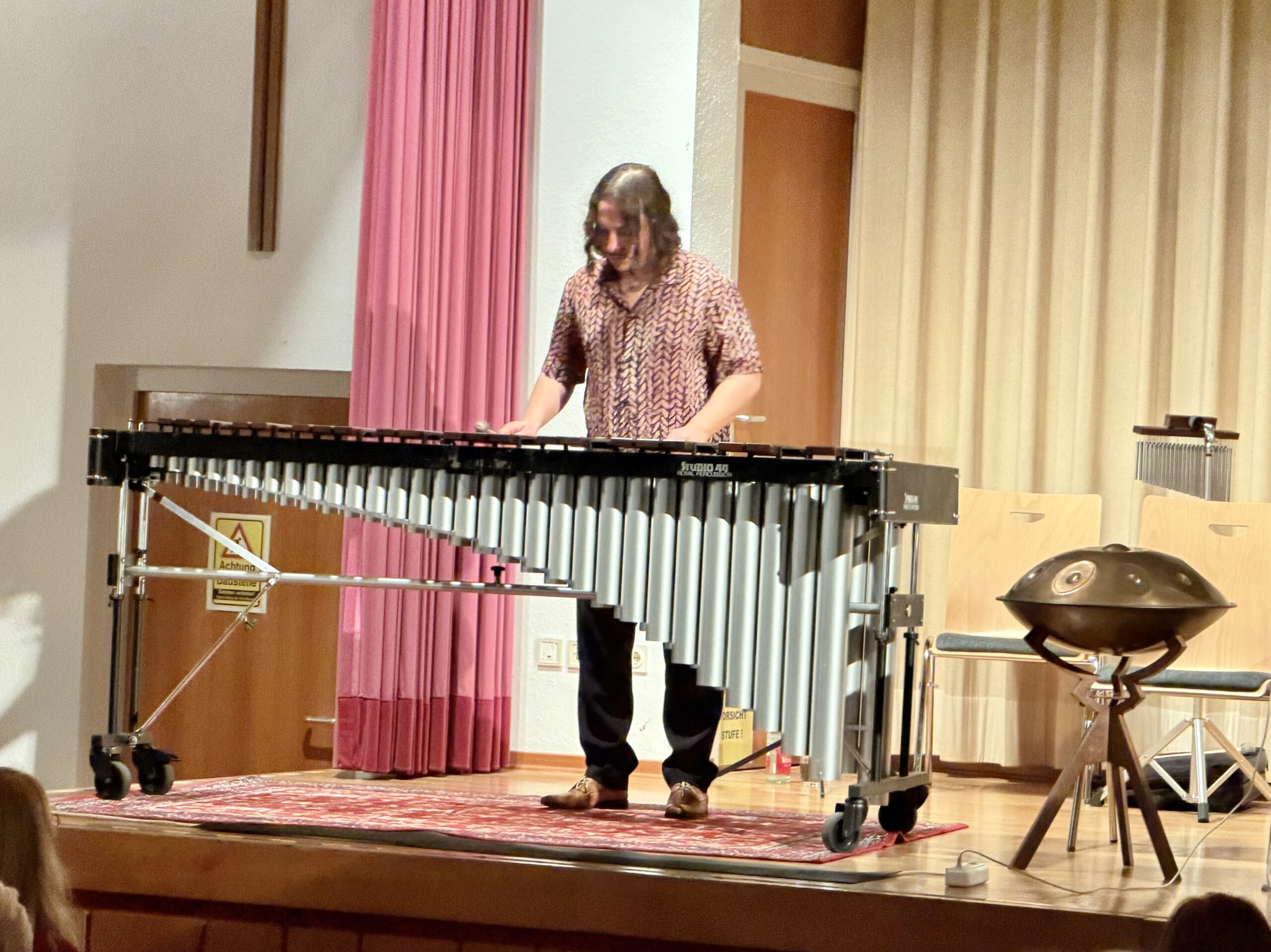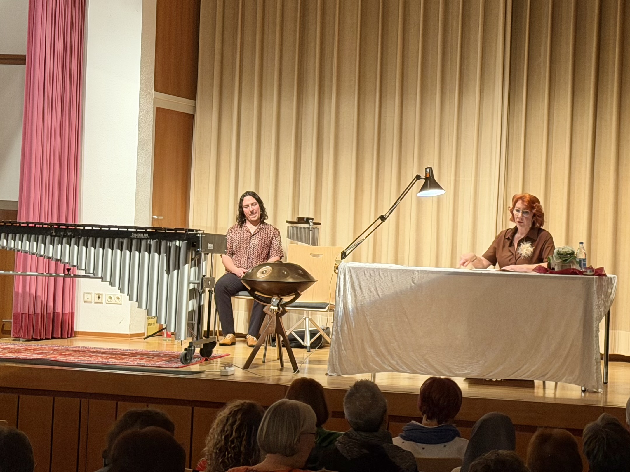 Nach einer kurzen Begrüßung Überleitung zum Thema durch den 2. Vorsitzenden, Dr. Carsten Köber übernahm zunächst Manuel Ehrlich am Marimbaphon und stimmte das Publikum mit sphärischen Klängen ein. Gekonnte wurden so auch im weiteren Verlauf dem Auditorium Reflexionsräume zwischen den von Frau Frey gelesenen Szenen angeboten.