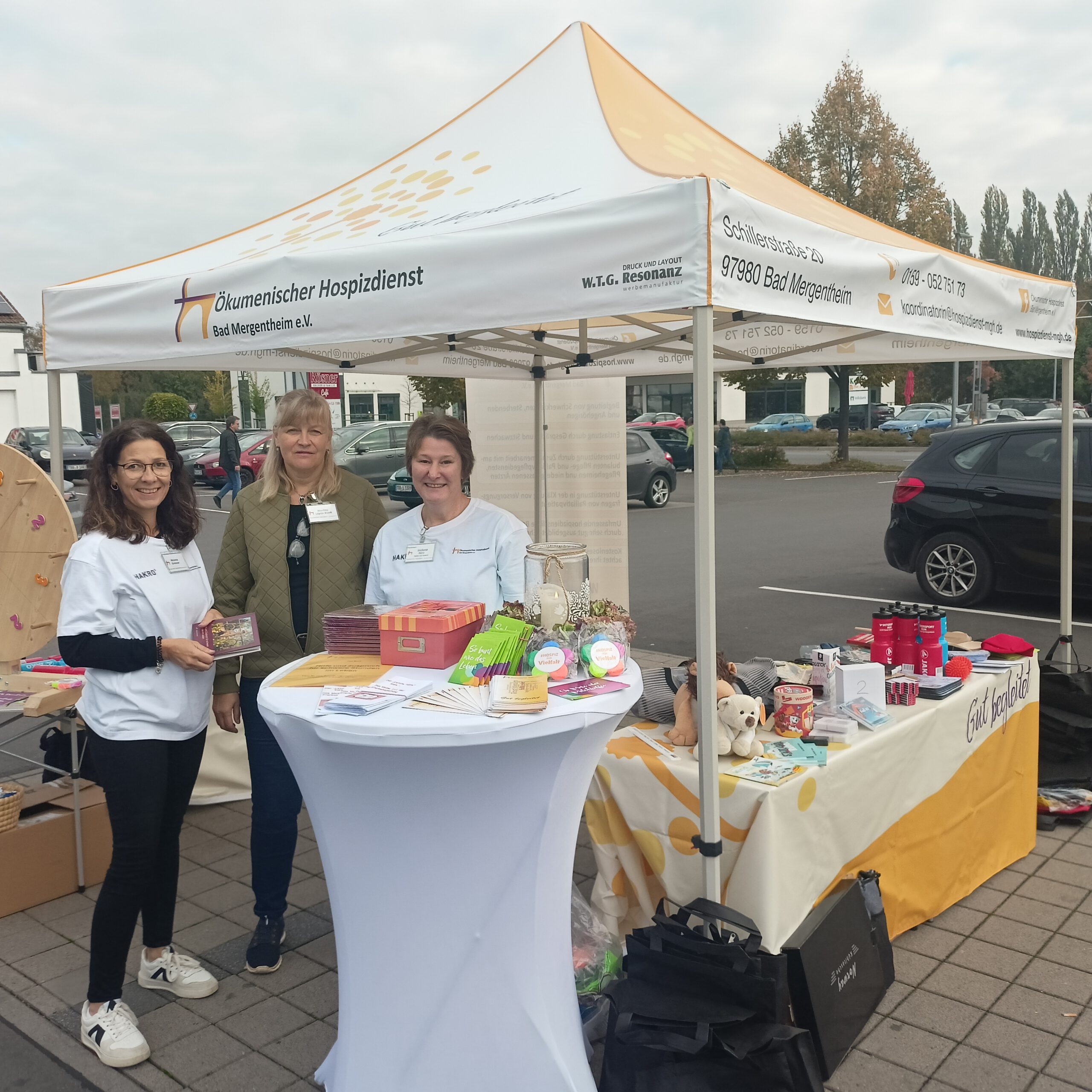 Anlässlich des Welthospiztages am 11. Oktober 2025 war der Ökumenische Hospizdienst Bad Mergentheim mit mehreren Aktionen in der Region präsent. Unter dem Motto der Gemeinschaft und Aufklärung über Hospizarbeit informierte das Team an zwei Standorten – in Bad Mergentheim und Lauda – über die vielfältige Arbeit des Dienstes. Unterstützt wurde die Aktion von zahlreichen engagierten Ehrenamtlichen, die mit Zeit, Tatkraft und selbstgebackenem Kuchen zum Gelingen beitrugen.