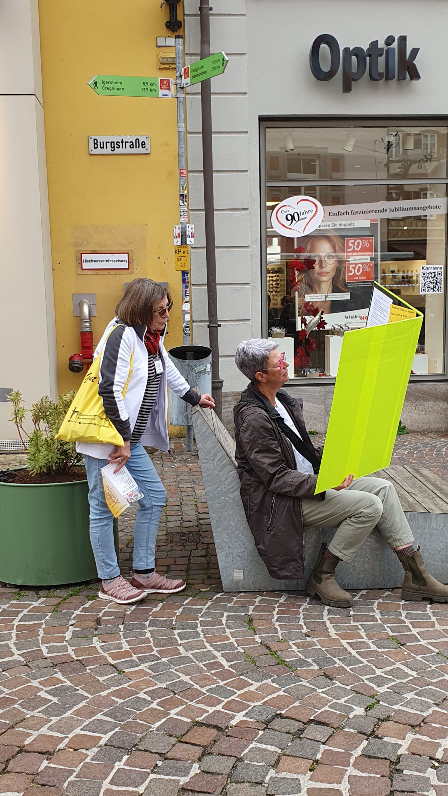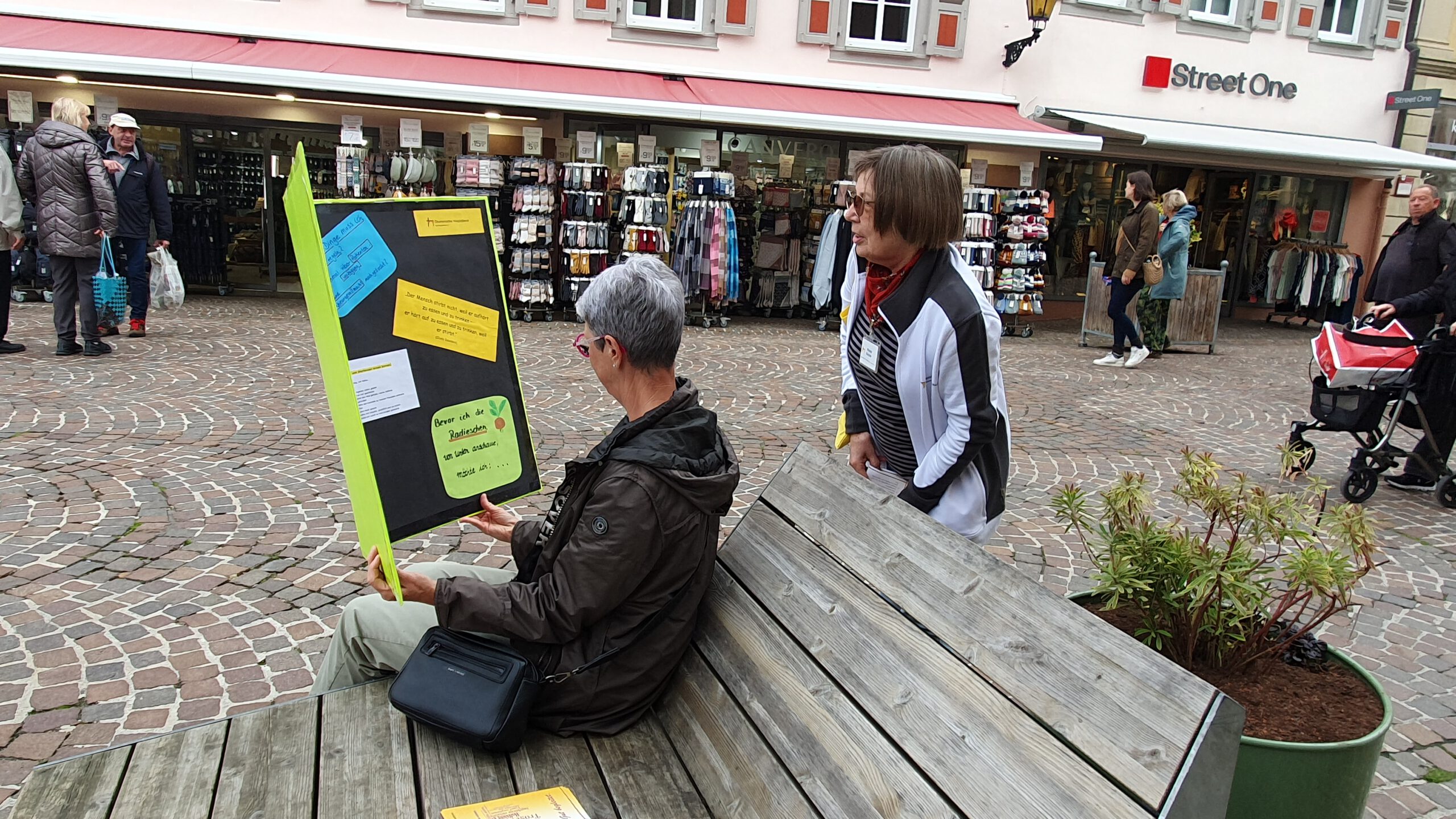 In der Bad Mergentheimer Innenstadt zog eine überdimensionale, in leuchtenden Farben gestaltete Zeitung zahlreiche Blicke auf sich. Sie bot den Anlass für viele interessierte Passanten, mit den Mitarbeitenden ins Gespräch zu kommen – auch Menschen mit eigenen Trauererfahrungen suchten hier den Kontakt zum Hospizdienst.